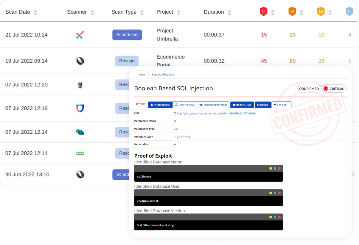 Invicti ASPM orchestrates all security testing data in a single view to boost visibility and insight for AppSec teams, automate vulnerability remediation workflows, and manage risks with key security performance indicators (KPIs). Correlate runtime-validated DAST findings with broader ASPM data to drive precise, scalable, and actionable AppSec programs.