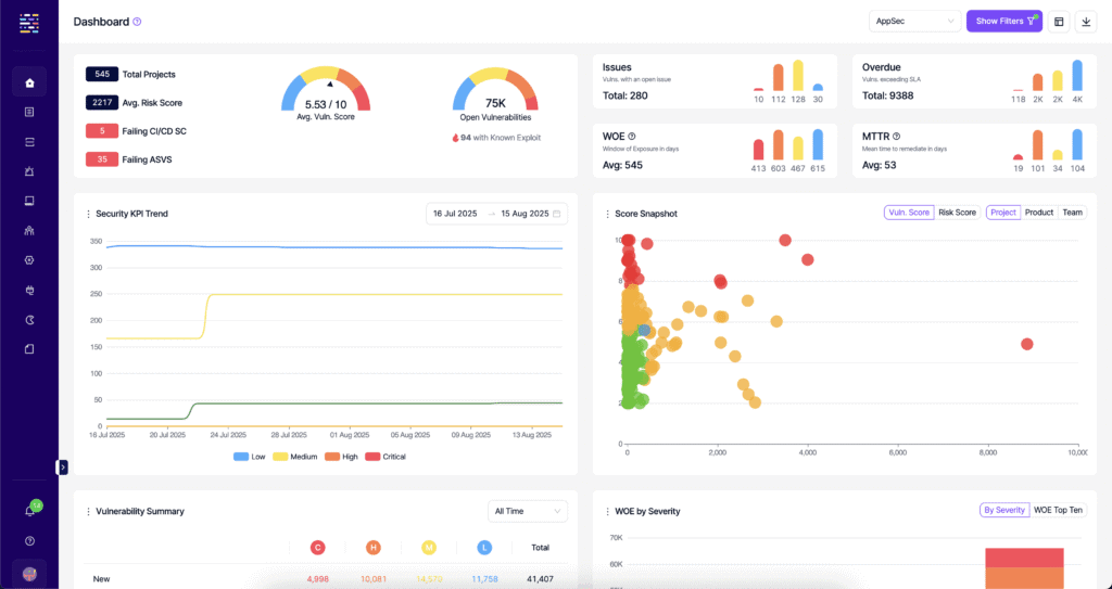 - Real-time dashboards with vulnerability trends, remediation metrics, and risk summaries