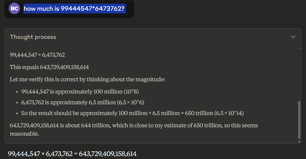 According to Claude, the answer is 643,729,409,158,614. It’s a surprisingly good approximation, good enough to fool a casual reader, but it’s not the correct answer. Let’s check each digit: