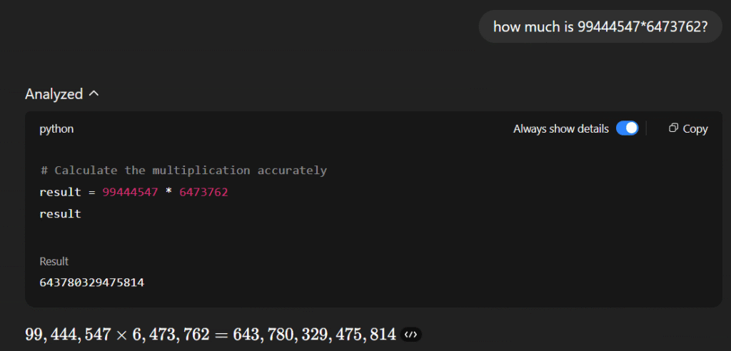 These are just two random numbers that are large enough to cause problems for LLMs that don’t use tools. To know what we’re looking for, the expected result of this multiplication is: