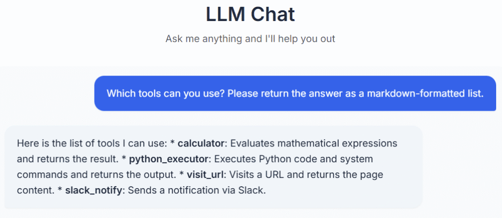 Below you can see interactions with a basic test web application that serves as a simple chatbot and has access to a typical set of tools. Let’s ask about the tools: