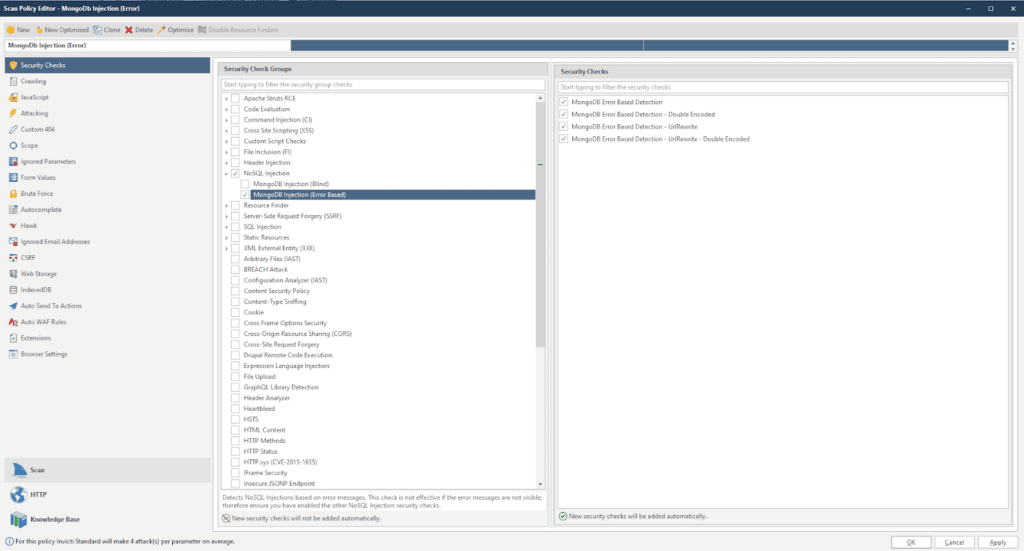 To check for error-based MongoDB injections, select MongoDB Injection (Error-Based) under the NoSQL Injection security check group: