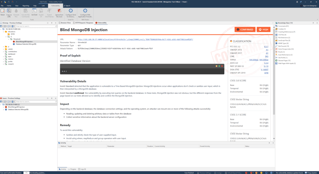 MongoDB databases are a critical part of the modern web, yet automated security testing tools for NoSQL databases are still far less mature than for relational databases. To address this, Invicti solutions can now detect when applications are vulnerable to MongoDB injections. Depending on the type of security check, the scanner can automatically confirm many such vulnerabilities by safely extracting version information from the MongoDB database.