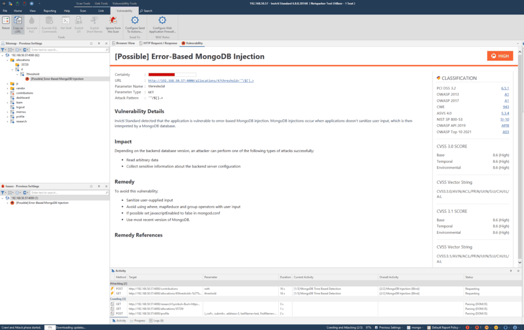 With the setup done, now you just hit the Scan button and examine the results. As a dynamic application security testing (DAST) solution, Invicti probes the application from the outside by sending requests that include test attack payloads. Where possible, the scanner attempts to safely exploit vulnerabilities to prove they are real. We will look at a MongoDB injection vulnerability report, find the insecure application code, remediate the issue, and retest to make sure it is fixed.