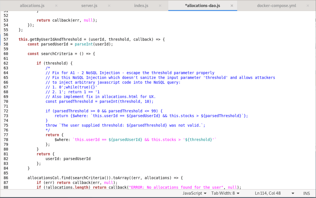 All injection attacks are made possible by unsanitized inputs, so this is where all remediation should start. Since the NodeGoat application was created by OWASP for educational purposes, it already includes a remediation method. Looking at the allocations-dao.js file in the screenshot below, you can see the fix suggested in the comment (in blue):