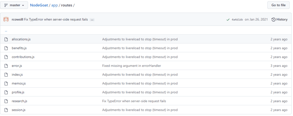 We can start by checking server.js in the root folder. This file is where the NodeGoat application starts and where we can see which config file is used and which files are referenced. We can quickly discover that the ./app/routes folder is referenced as routes on line 16, so we can continue checking app/routes to find the vulnerable code: