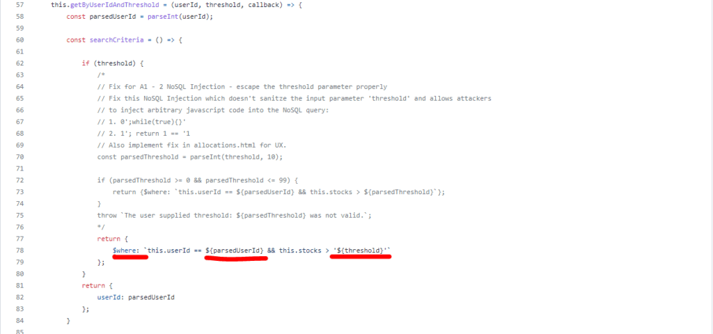 Finally, in the allocations-dao.js file, we can search for the getByUserIdAndThreshold() method to see what it does. Immediately, you can see that the MongoDB query uses the $where operator, which is an instant red flag (as explained earlier). Unsurprisingly, we can also see that the input parameters are directly used in the query without any validation or sanitization: