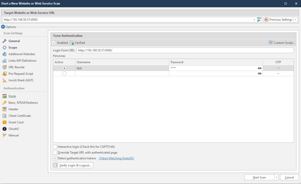 For this simple test site, all we need to do to create a scan profile is to set the target URL and enable form authentication: