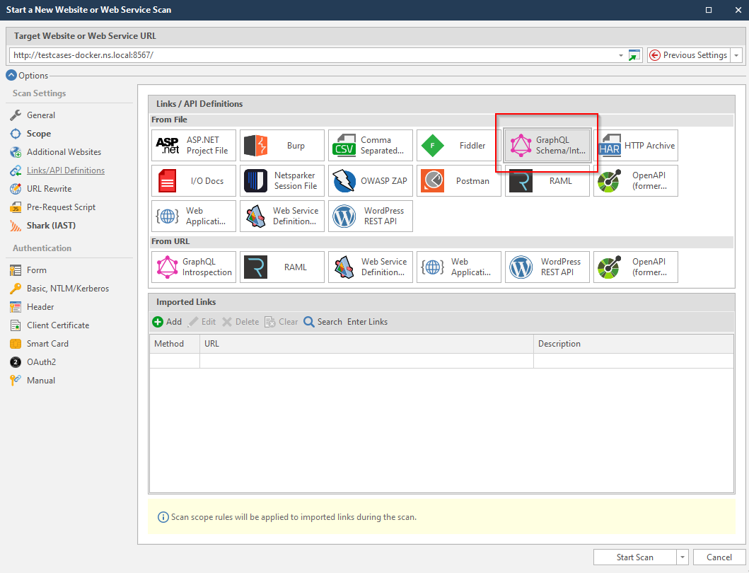 - From the Start a New Website or Web Service Scan dialog, select Links/API Definitions > GraphQL Schema/Introspection.