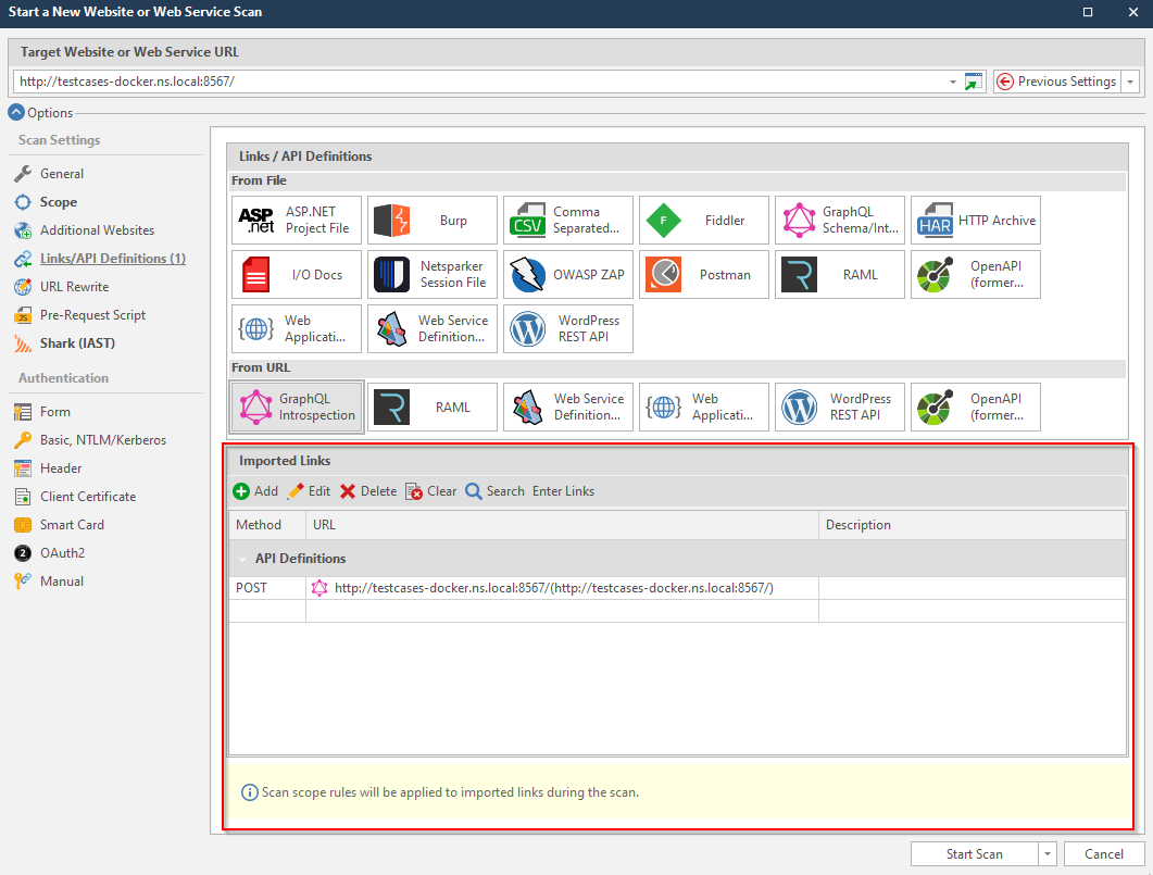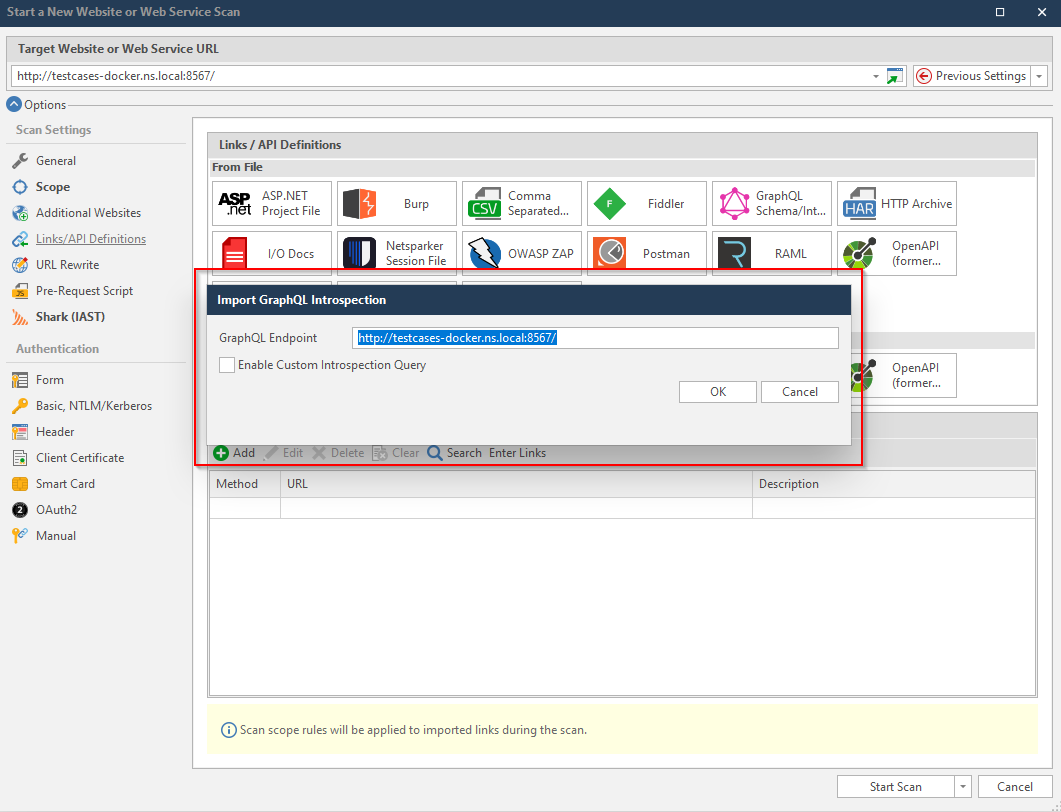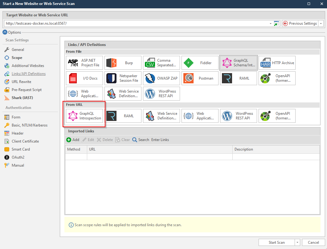 - From the Start a New Website or Web Service Scan dialog, select Links/API Definitions > GraphQL Introspection.