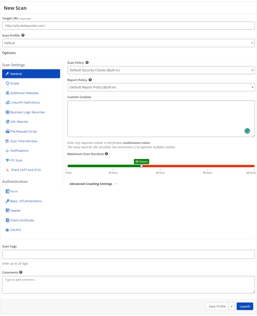 | Comments | This option allows users to add a comment to their scan during a launch. This comment is displayed on the scan report. |