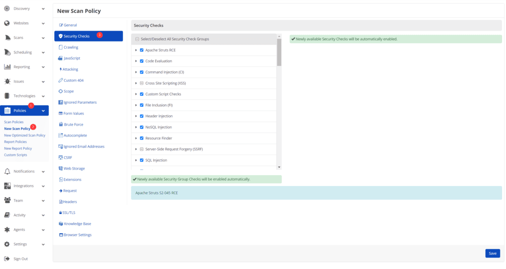 - From the main menu, go to Policies > New Scan Policy > Security Checks.