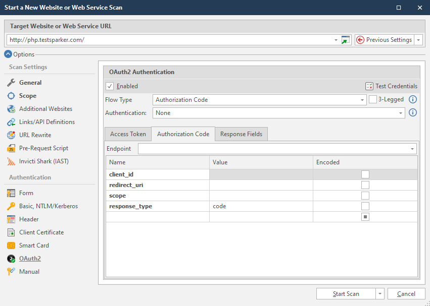 Endpoint(s) and associated parameters must be configured. Invicti automatically lists the default parameter names and values defined in the RFC-6749. Because these parameter names and values may vary between implementations, Invicti allows you to add, remove and edit them. |