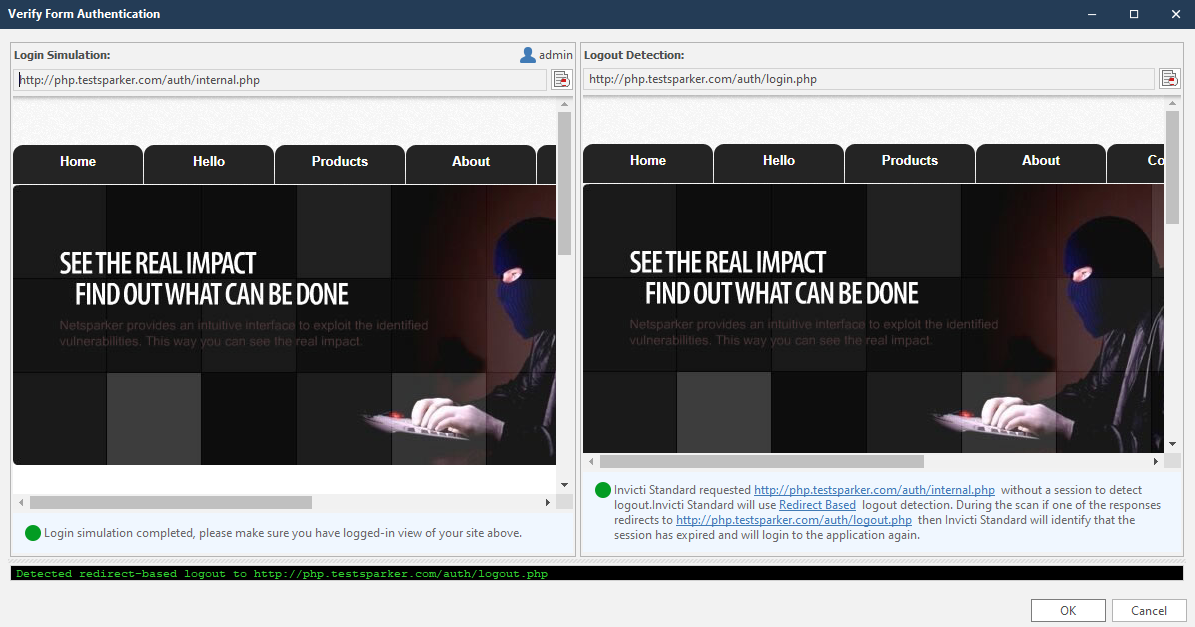 You can verify the form authentication configuration either while configuring it or before starting a scan. Invicti prompt you to conduct the verification process if it is not already completed prior to starting a scan. Verifying the logout detection pattern is crucial because Invicti will try to detect this pattern during the scan and when this pattern is matched, it will try to re-authenticate automatically to the website before proceeding with any other crawling or attacking requests, ensuring the password protected section is completely scanned.