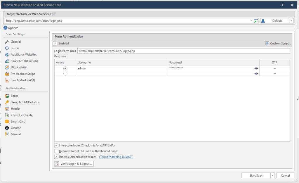 - From the Start a New Website or Web Service Scan dialog, select Form.