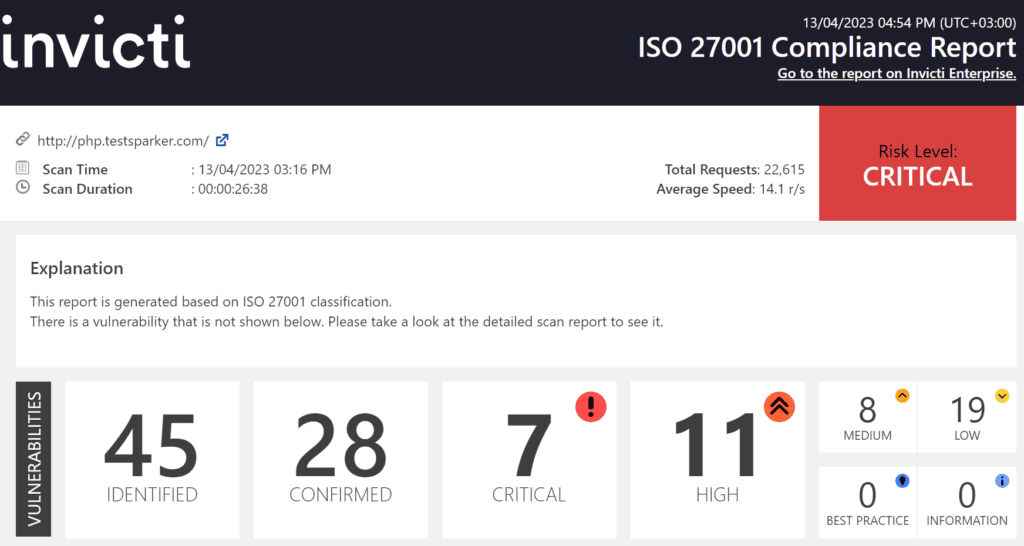 There can be other vulnerabilities and security issues that can be found in your web applications but not listed in the ISO 27001 Compliance Report. The report does not replace an official one and cannot be used as an ISO 27001 Compliance report.