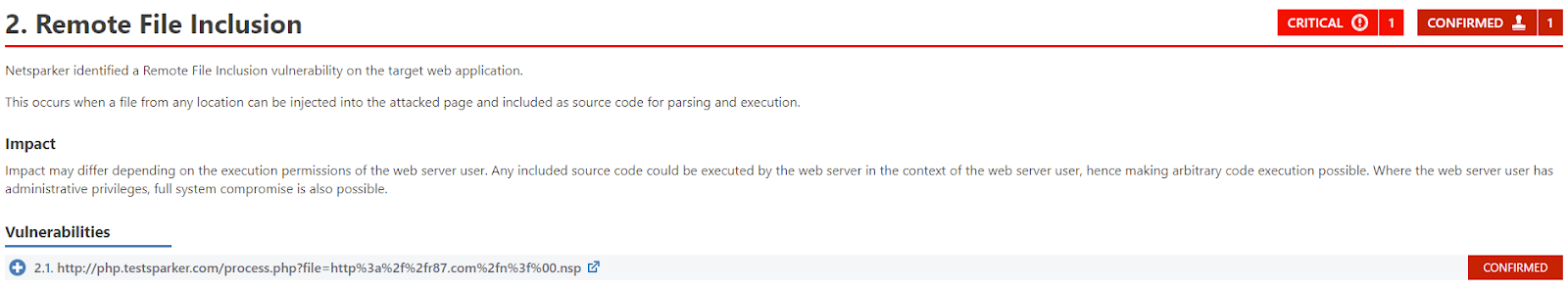 - Confirmed Vulnerabilities The total number of vulnerabilities that Invicti verified by taking extra steps such as extracting some data from the target
