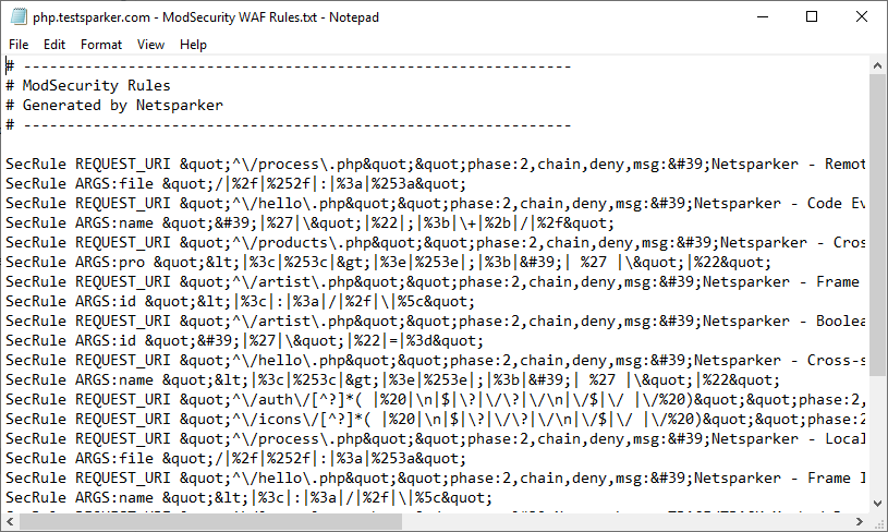 - Click Save. The ModSecurity WAF Rules Report opens in your default text editor (this example shows Notepad).