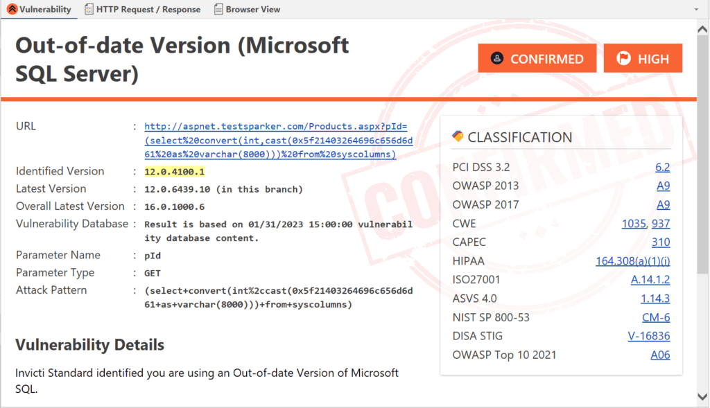 - Invicti’s Proof Based ScanningTM technology exploits this vulnerability in a read-only and safe manner.