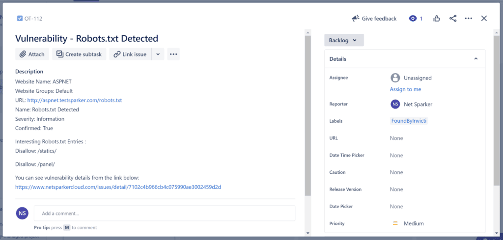 Once the scan is complete, Invicti creates tickets in your issue tracking system.