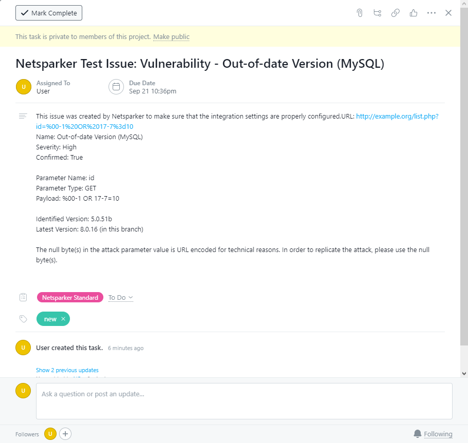 - Click the Asana Send to Action is executed for the selected vulnerability. link to view the newly-created issue in Asana. The vulnerability is automatically exported to Asana. You can view it in the relevant Asana task.