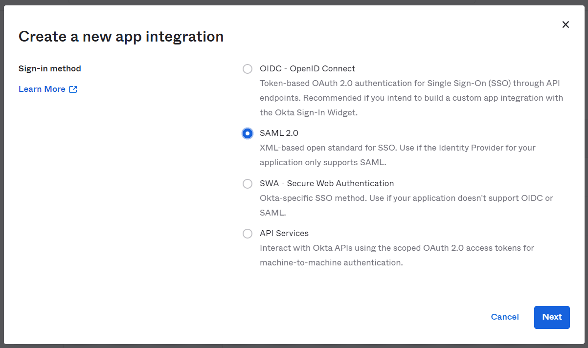 - From the Create a new app integration dialog, select SAML 2.0. Select Next.