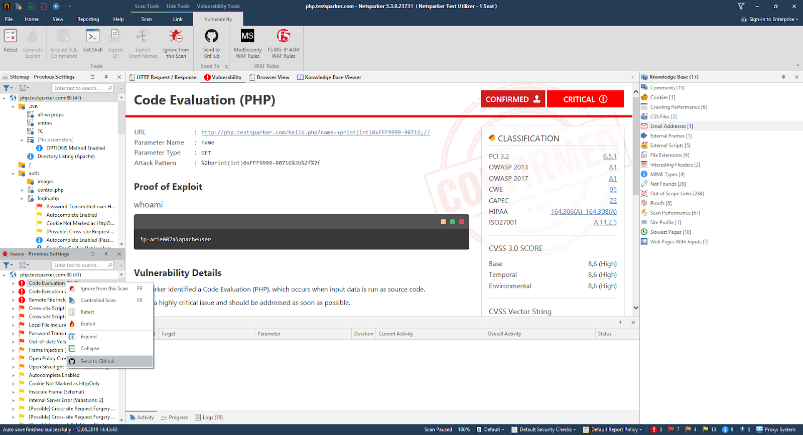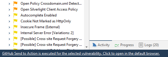 - In the Issues panel, right click the vulnerability you want to export and select Send to GitHub. (Alternatively, from the ribbon, click the Vulnerability tab, then Send to GitHub.) A confirmation message and link is displayed at the bottom of the screen.
