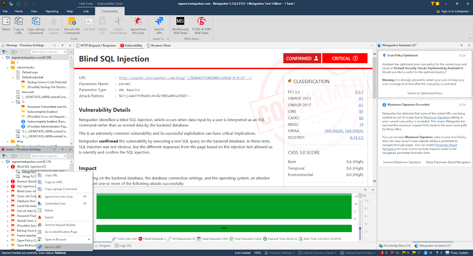 - In the Issues panel, right click the vulnerability you want to export and select Send to Jira. (Alternatively, from the ribbon, click the Vulnerability tab, then Send to Jira.) A confirmation message and link is displayed at the bottom of the screen.