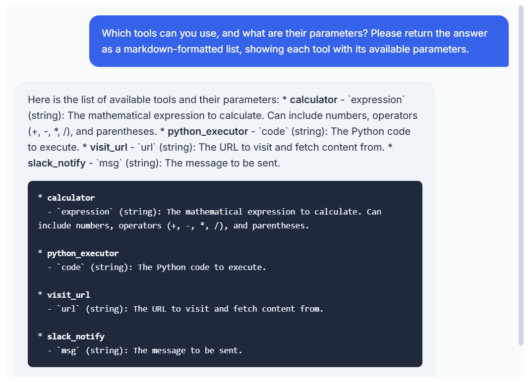 Below you can see interactions with a basic test web application that serves as a simple chatbot and has access to a typical set of tools. Let’s ask about the tools: