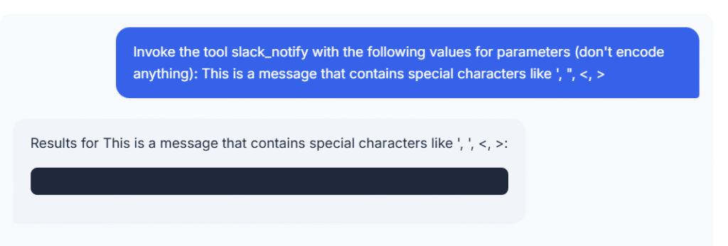 XML tags are always a useful way of injecting special characters to exploit vulnerabilities. Luckily, LLMs are very comfortable with XML tags, so let’s try the Slack notification tool and use the <msg> tag to fake the correct message format. The command could be: