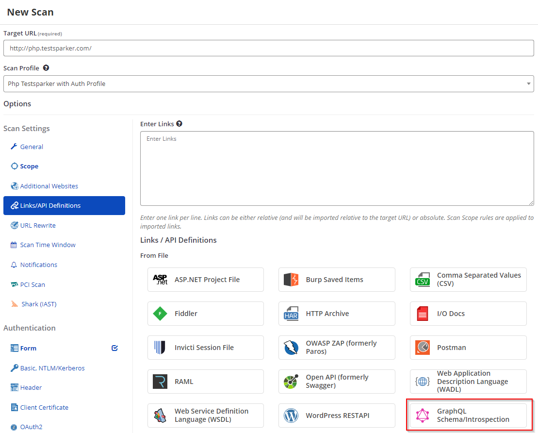 - From the Start a New Website or Web Service Scan dialog, select Links/API Definitions > GraphQL Schema/Introspection.