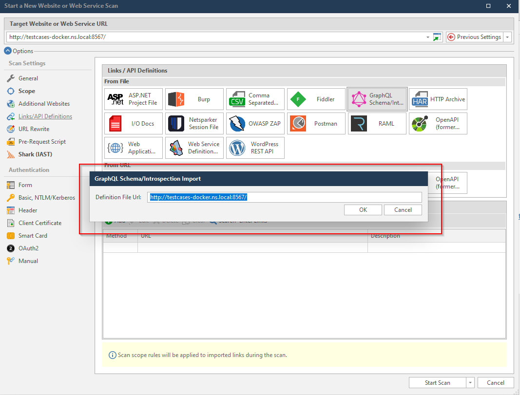 - From the Start a New Website or Web Service Scan dialog, select Links/API Definitions > GraphQL Introspection.