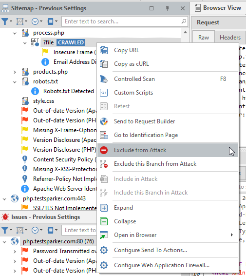- Right-click the branch you want to exclude and select Exclude this Branch from Attack.