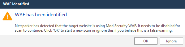 WAF Identifier Security Check runs before Invicti makes any attacks to the target site and analyzes whether the website is using any WAF. If a WAF is identified, Invicti Standard shows a pop-up notification. Users can do one of the following:
