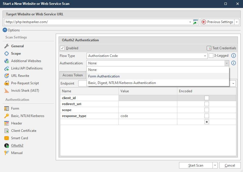 - If OAuth2 endpoints requires an additional authentication, such as Form or Basic, Digest, NTLM/Kerberos authentication, you must configure them from the Authentication dropdown (see Configuring Form Authentication in Invicti Standard and Configuring Basic, Digest, NTLM/Kerberos Authentication in InvictiStandard).