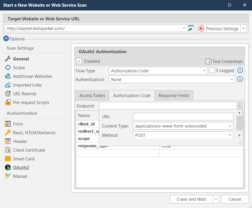 Endpoint(s) and associated parameters must be configured. Invicti automatically lists the default parameter names and values defined in the RFC-6749. Because these parameter names and values may vary between implementations, Invicti allows you to add, remove and edit them. |
