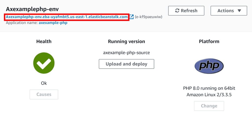 - Take note of your environment’s new URL created by AWS Elastic Beanstalk: