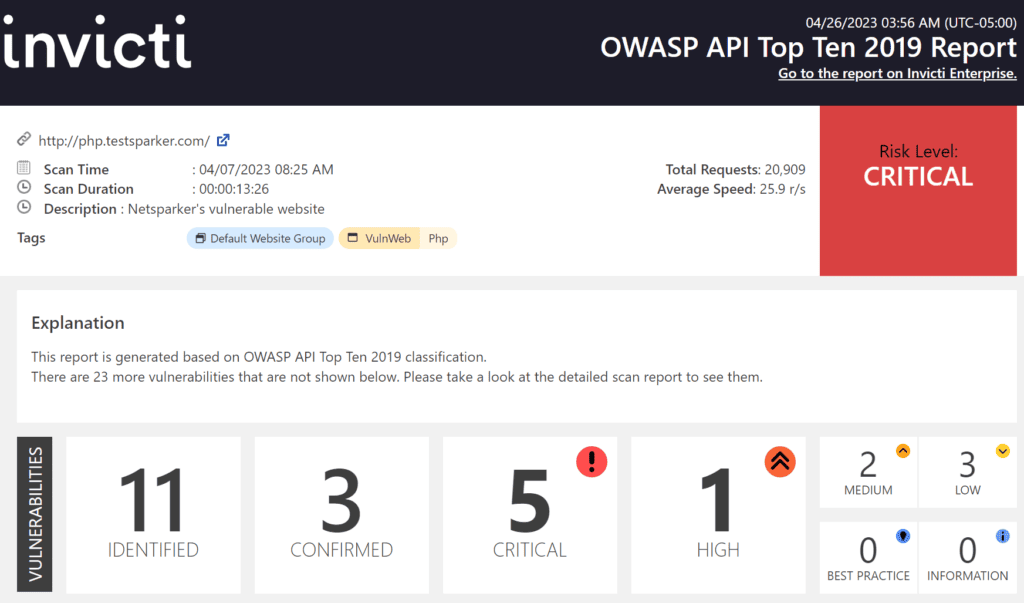 There can be other vulnerabilities and security issues found in your web applications but not listed in the OWASP API Top Ten Report. For the comprehensive security report, generate the Detailed Scan Report.