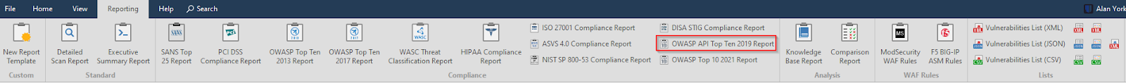 - From the Reporting tab, select the OWASP API Top Ten Report.