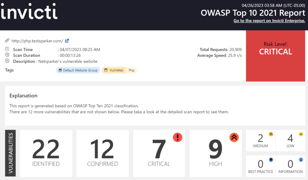 There can be other vulnerabilities and security issues found in your web applications but not listed in the OWASP Top Ten 2021 Report. For the comprehensive security report, generate the Detailed Scan Report.