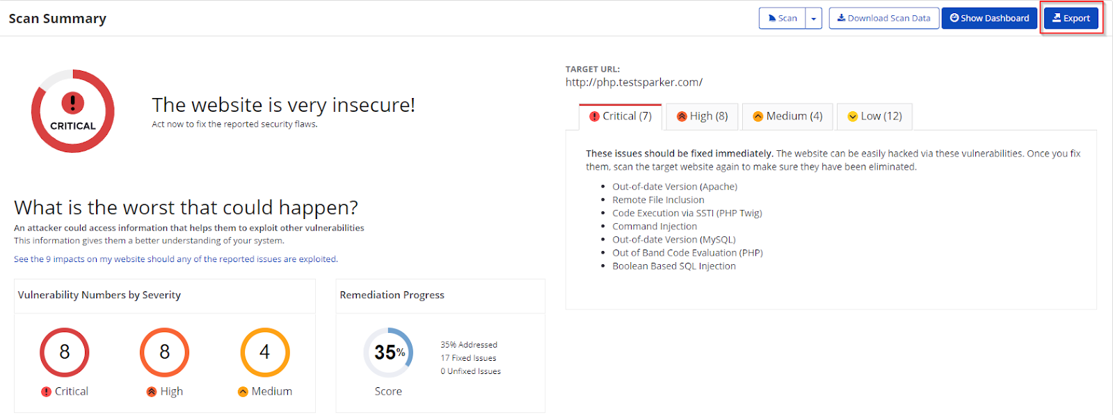 - Confirmed Vulnerabilities The total number of vulnerabilities that Invicti verified by taking extra steps such as extracting some data from the target