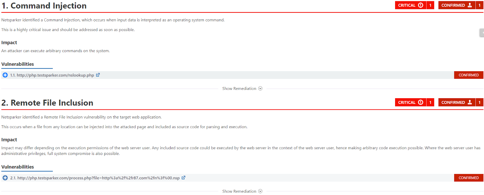 - Confirmed Vulnerabilities The total number of vulnerabilities Invicti that Invicti verified by taking extra steps such as extracting some data from the target