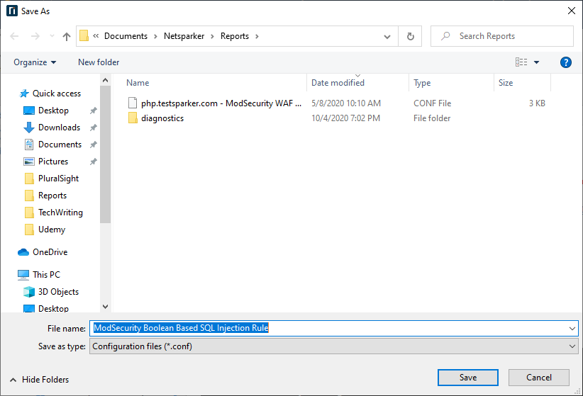 - From the Vulnerability tab, click ModSecurity WAF Rules. The Save Report As dialog is displayed.