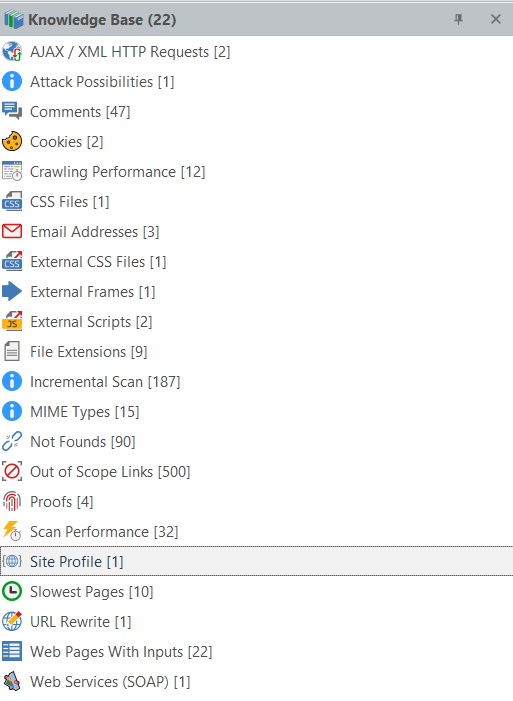 Invicti forms Knowledge Base nodes on its findings. However, if the target web application does not expose its fingerprint, no site profile will be built and therefore the Site Profile node will not be displayed.