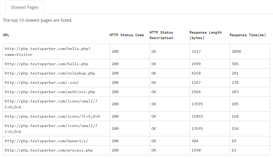 In addition to the scan performance, the slowest pages may have errors or inefficiencies in the code. It can also be used to perform Denial of Service (DoS) attack. Even though pages that are slow to load do not pose a direct security threat, it is good to know about them for troubleshooting purposes.