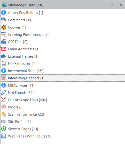 Invicti forms Knowledge Base nodes on its findings. If the Interesting Headers node is not listed, it means that Invicti did not find any.