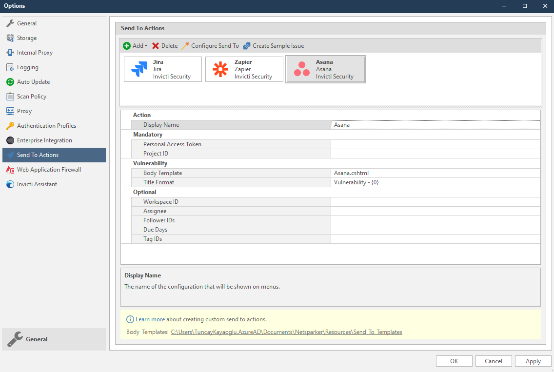 This topic explains how to configure Invicti Standard to send a detected vulnerability to Asana (including using the wizard).