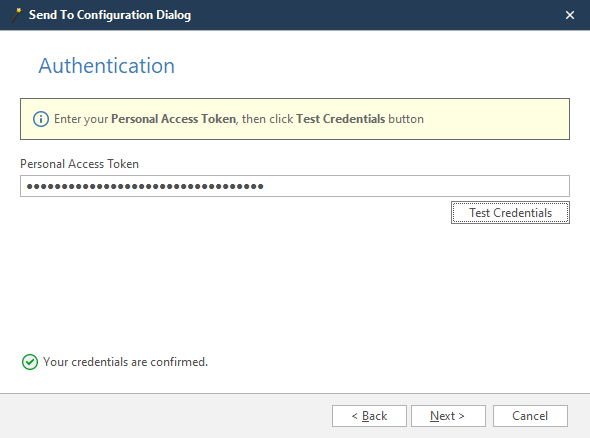 - In the Personal Access Token field, enter the token, and click Test Credentials.