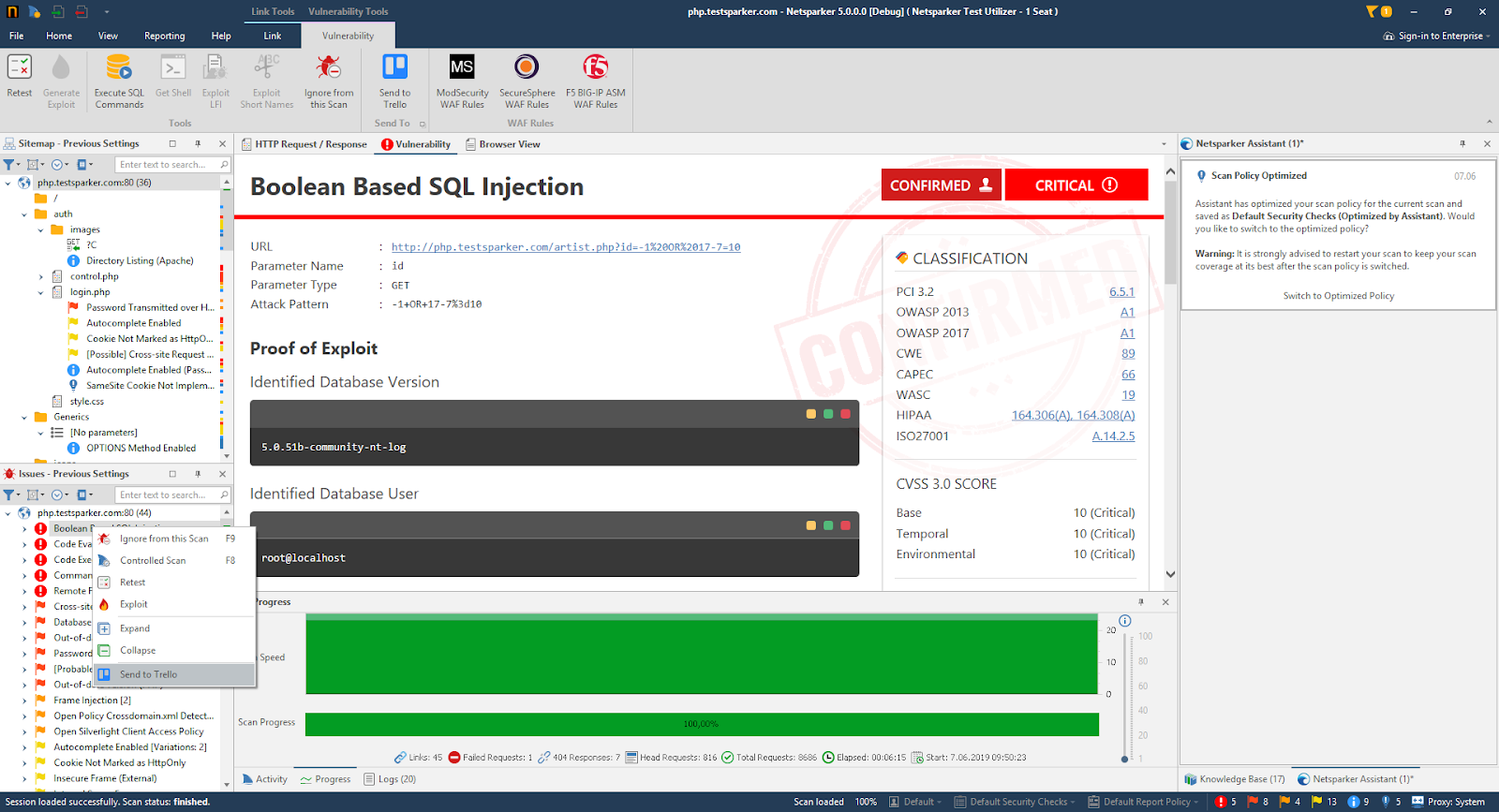 - In the Issues panel, right click the vulnerability you want to export and select Send to Trello. (Alternatively, from the ribbon, click the Vulnerability tab, then Send to Trello.) A confirmation message and link is displayed at the bottom of the screen.
