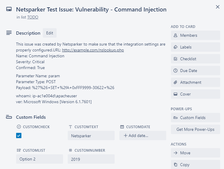 - The vulnerability is automatically exported to Trello. You can view it on one of Trello's cards.